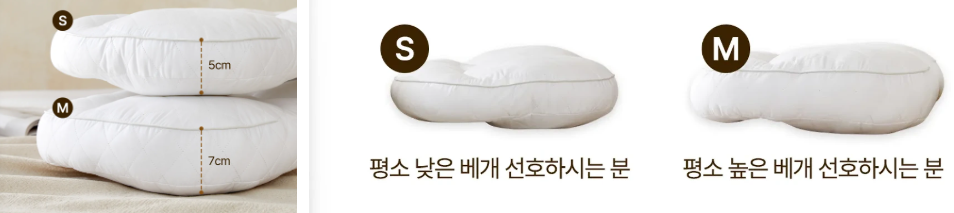 - 높이: 바로 누웠을 때, 베개의 높이가 어깨 높이와 비슷해야 목에 부담이 가지 않습니다.